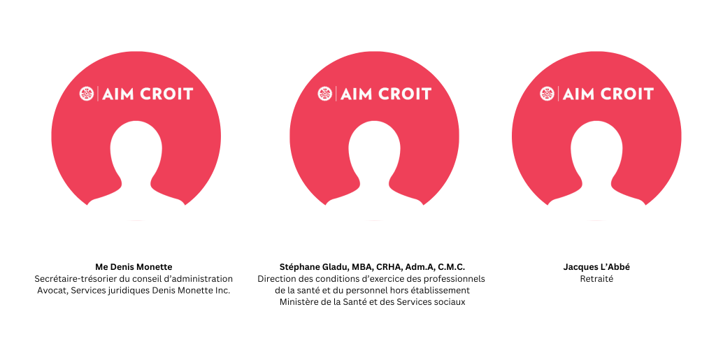 Pour devenir membre du conseil d’administration d’AIM CROIT, vous devez déposer une lettre d’intention sur le poste souhaité détaillant vos qualifications, le potentiel de votre apport et votre curriculum vitae. Votre candidature sera analysée par les administrateurs du conseil et vous serez avisé si vous êtes retenu pour une entrevue. L’acceptation ou le rejet de votre candidature sera déterminé après le vote du conseil d’administration et validé par la suite lors de l’Assemblée générale annuelle.
